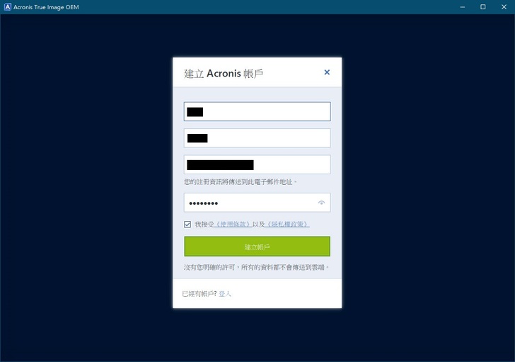 安裝完後要先建立一個Acronis帳戶,這時必須確定網路連線正常才能做後繼動作