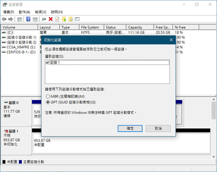 初次使用時會要求初始化,如要當系統碟可以預設方式設定(GPT)即可