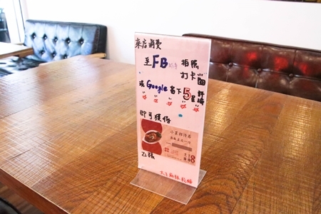 找個好位子坐下後,馬上看到桌上來店消費的活動,而且活動辦法還很簡單,只要拍照上傳FB就能拿優惠,貪吃的我當然不會錯過,直接參加拿好康啦!