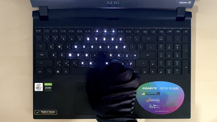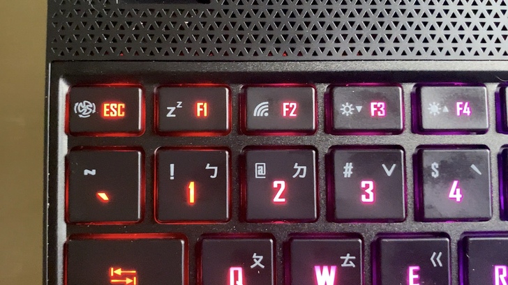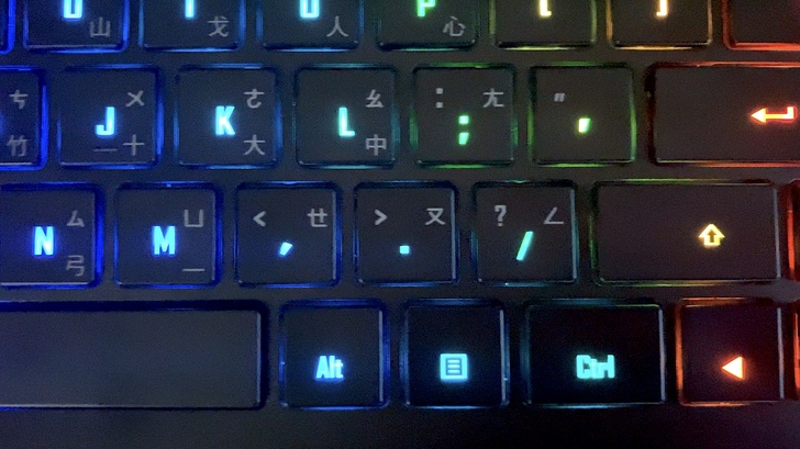 鍵帽的快速鍵、注音、倉頡是印刷,英文和主要功能鍵才是透光的背光,這在晚上無光的環境中,只會看到英文鍵,就不會看到繁雜的注音、倉頡。而鍵帽英文字體也延續上一代沒有改變,維持了電競的元素。希望下一代 AERO 可以採用簡約大方、適合設計工作的字體。