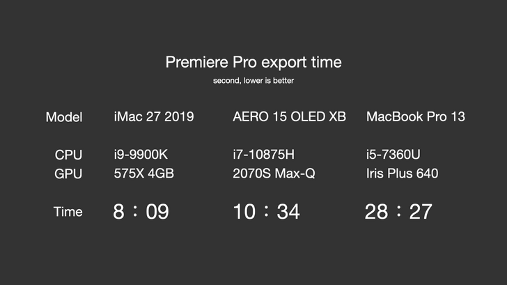 然後看到實際在工作剪輯的效能,在 Premiere 中 AERO 托拉時間軸都能順暢自如,比一般低電壓的處理器好太多了。實測三台電腦以 Premiere 輸出同一部小影片,AERO 15 OLED XB 的成績已經接近桌上型電腦,而 13 吋低電壓處理器、不具獨顯的機種差距就比較大。