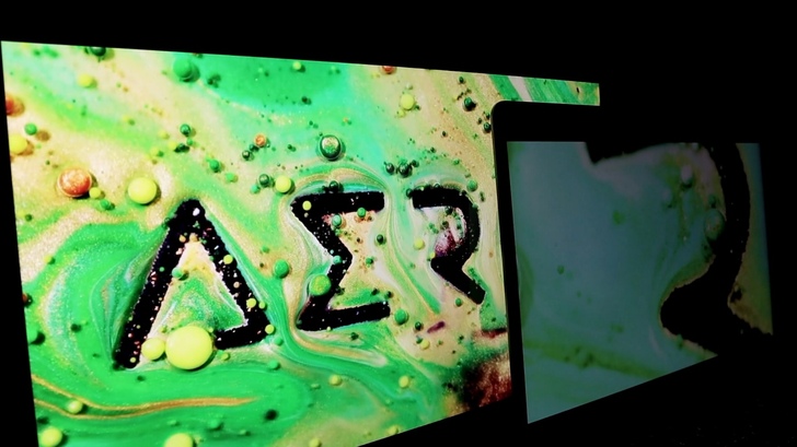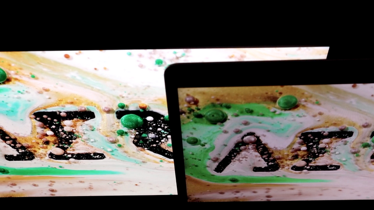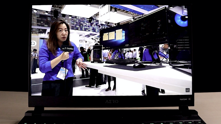 左邊是 AERO 15,對比右邊小台同樣支援 DCI-P3 的筆電螢幕,由於是透過相機紀錄,在影片畫面中差異不是很明顯,現場看到 AERO 15 OLED 亮度更高、色彩更鮮明,而黑色更深邃。