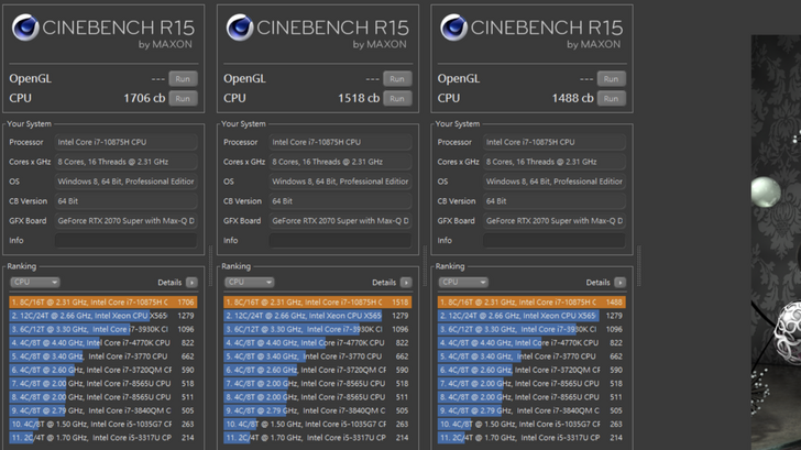 首先來看 CPU 效能在 Cinebench R15 的表現,最高可達 1706 cb,後面幾次落在 1518~1488 cb。