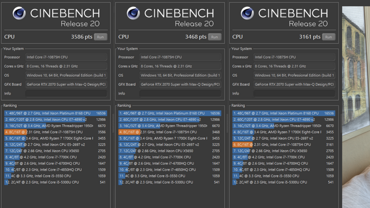 在 Cinebench R20 中,最高可達 3586 pts,後面幾次落在 3468~3161 pts。這樣的效能已經打敗許多桌上型的 i5 處理器,都比之前開箱的 9400F 效能還強。甚至跨級對比桌上型旗艦 i9–9900K 處理器,同樣是 8C16T,10875H 都能有 9900K 60%~70% 效能。