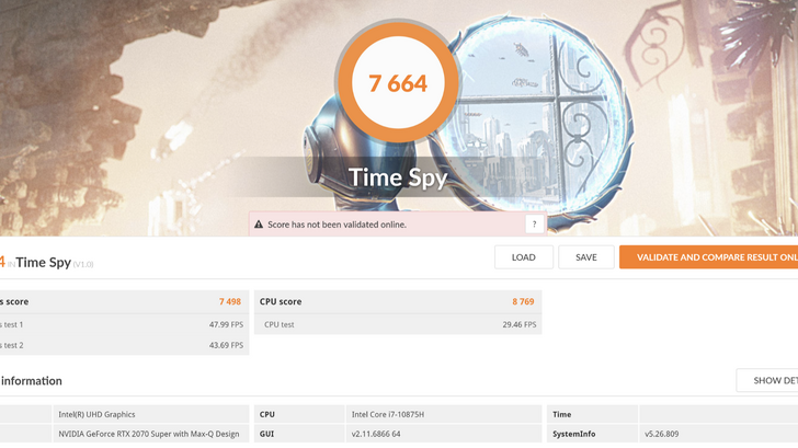 而在 3DMark Time Spy 中,也有 7664 分。目前大多遊戲都能在這樣的硬體條件下順暢運行。而對於剪輯、繪圖等較吃顯卡效能的工作,也能發揮這張 2070 Super 的價值。