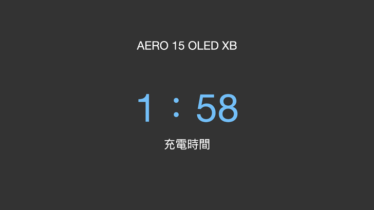 AERO 15 230W 的充電器,讓完整充電時間約兩個小時(1hr 58mins)。