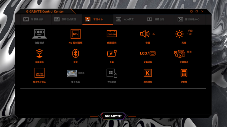 要開啟 Pantone 校色,記得從技嘉內建的 Control Center 》管理中心,Pantone 螢幕色彩校正開啟。