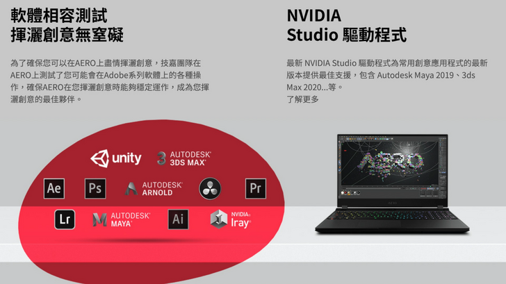 此外 AERO 15 也針對幾款平面設計師、3D 設計師、影片剪輯常用到的軟體進行相容性測試,減少軟硬體錯誤的發生。