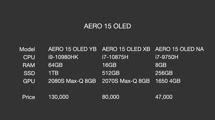 本次選購建議著重在有 AMOLED 的 AERO 15 OLED,其他尺寸、HDR 和 Classic 範圍太大,先不列入。首先要瞭解到 OLED 這款在所有 AERO 中是定位比較高的,特色就是 4K AMOLED。最高階有 i9–10980HK 配 2080S 的,價格大概是 13 萬,適合銀彈充裕,決心要攻頂的朋友。