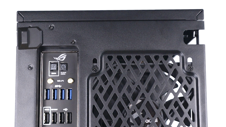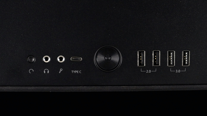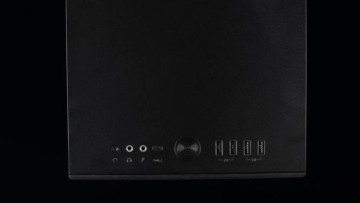 頂面全平面的靜音蓋板與散熱蓋板,更換時完全無需螺絲,格外方便。頂部由左至右分別是:重開機鍵、耳機接孔、麥克風接孔、USB-C 支援 USB3.2 Gen2 10Gbps、電源鍵、USB2.0 兩個、USB3.2 Gen1 5Gbps 兩個。I/O 豐富且支援高速,是目前旗艦機的規格。