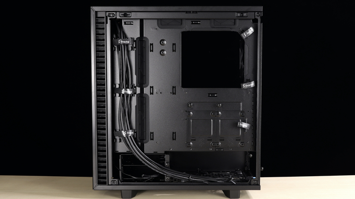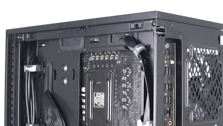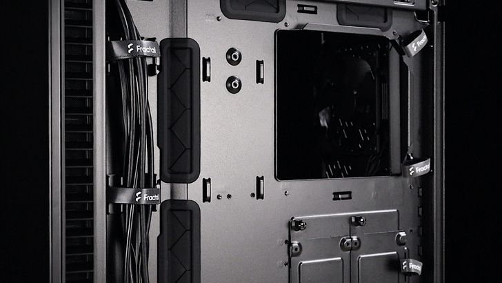 背後有 Fractal 的魔鬼氈束線帶,出廠已經整理好前 I/O 連接線。通常走電源線的位置也預裝了三個魔鬼氈。