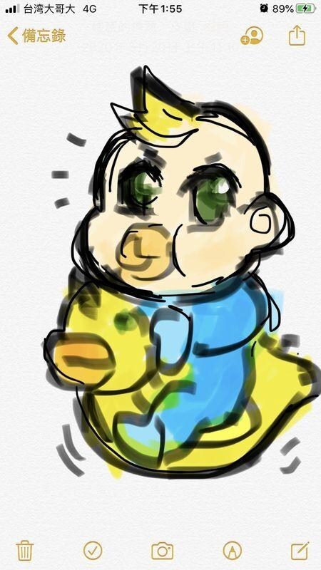 利用Iphone的備忘錄手繪了金貝貝的圖片,沒有觸控筆只靠手指抹啊抹的修改,不到五分鐘就完成啦~雖然有點像養太好的金貝貝,不過還是很喜歡XDD