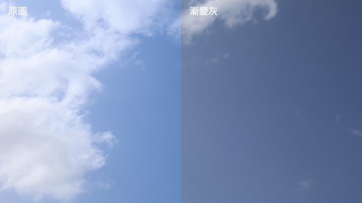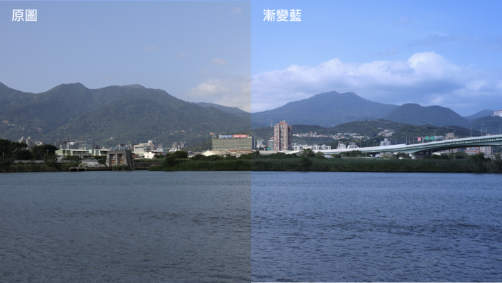漸變藍的濾鏡,讓天空與水面的顏色更加明顯。感覺少了點灰色,藍色飽和度更強,畫面看起來更銳利、活潑。