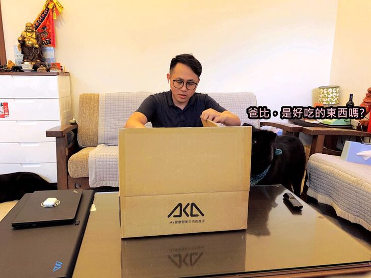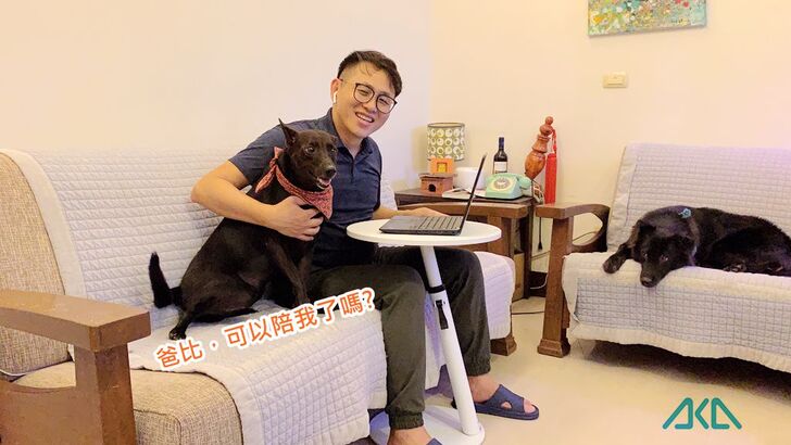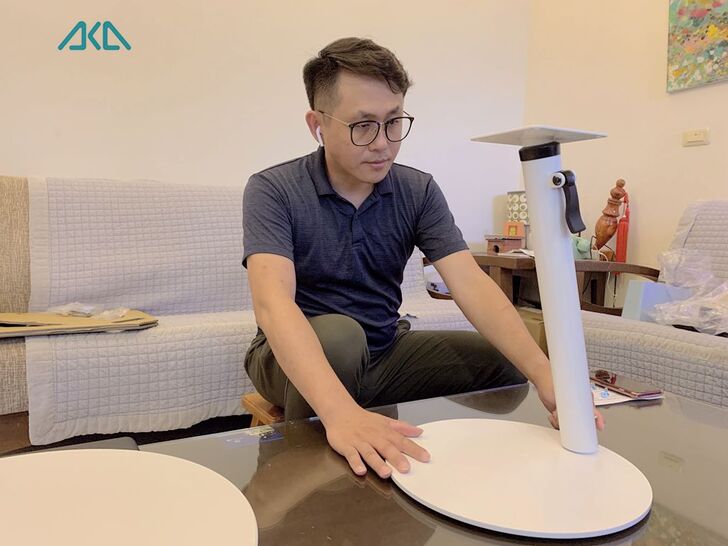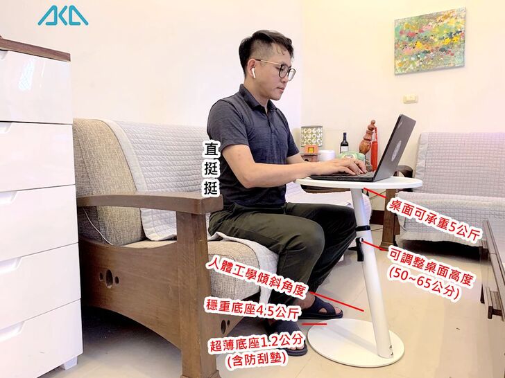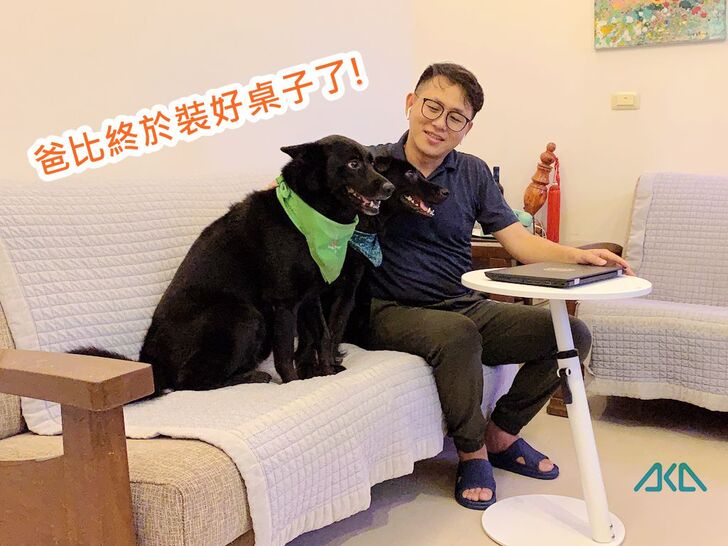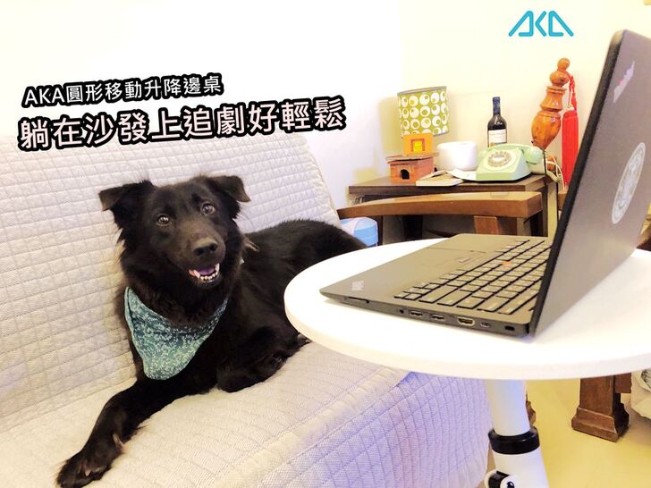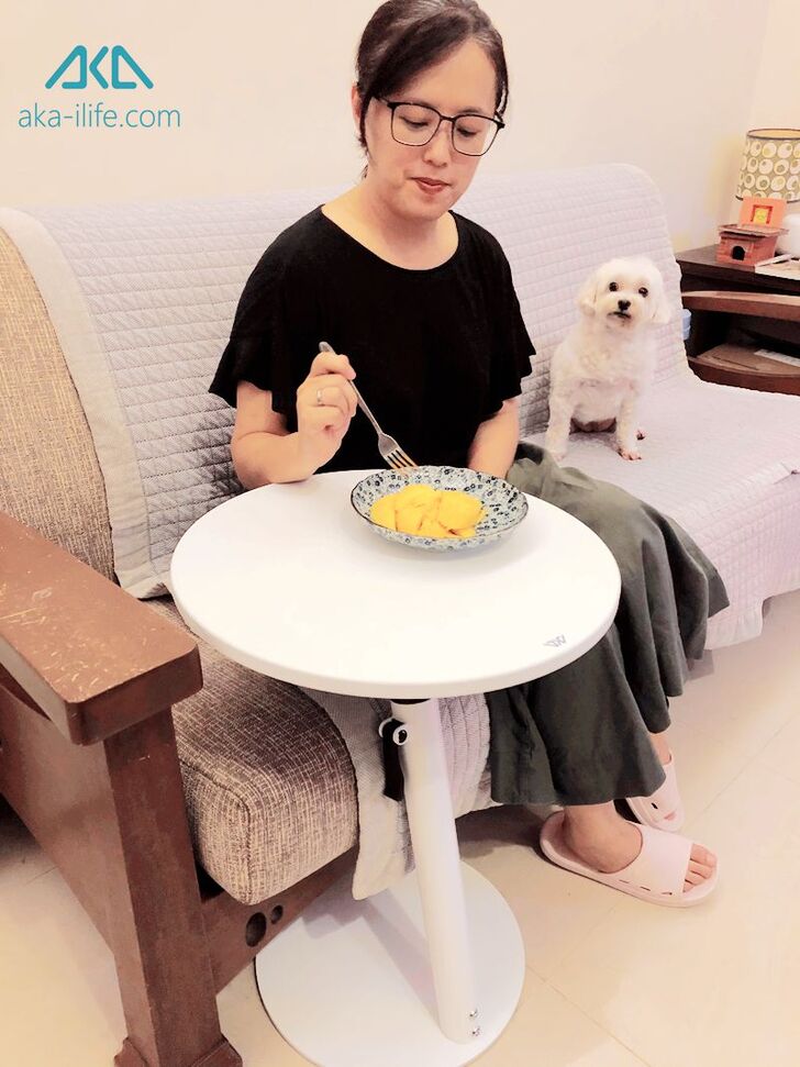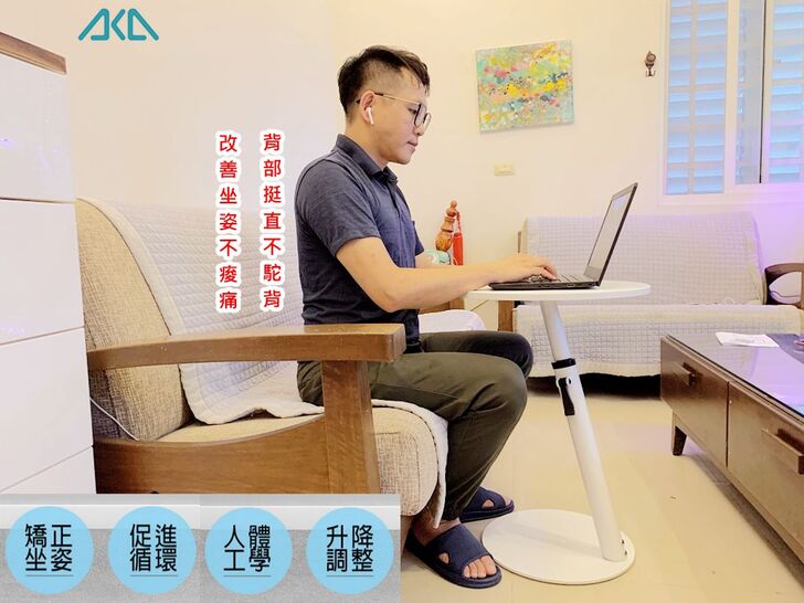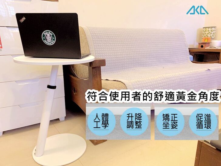 為了解決這個問題,我找到一款產品「AKA圓形移動式升降邊桌」,讓我在客廳也能舒服地坐在沙發上使用電腦,不用在彎腰駝背,坐在小板凳上打字了。