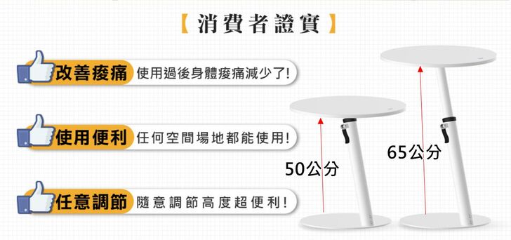 邊桌最低高度是50公分,最高可升至65公分,使用者可依據自己的使用需求來調整桌面高度。