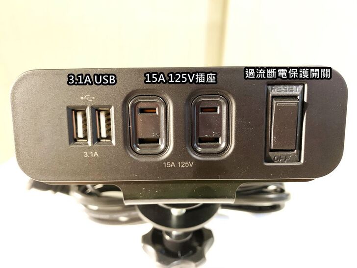 這款電源充的配置上,有二組3.1A的USB充電孔、兩組15A的125V插座,還有一組過流斷電保護開關。