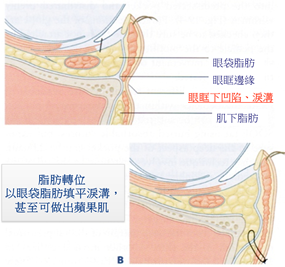 這些差別在哪裡呢?首先就是淚溝,傳統眼袋手術常忽略淚溝的處理,只是很努力的將脂肪移除,結果是凸顯了一些患者臉部略顯凹陷的結構,就是所謂的淚溝。約十多年前開始有人用脂肪移植或下移的方法,只是並不盛行。直到近年來重新檢視許多早期眼袋手術的結果,了解到淚溝處理應是眼袋手術的重要部分,本文也比較了一些淚溝的處理方法!