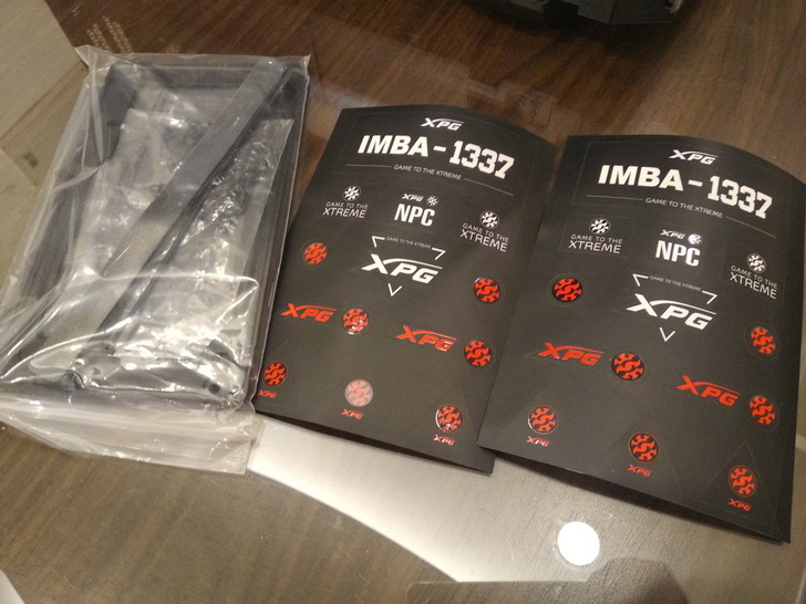 配件盒內的物品,有XPG貼紙、電源供應器安裝檔板及螺絲包等