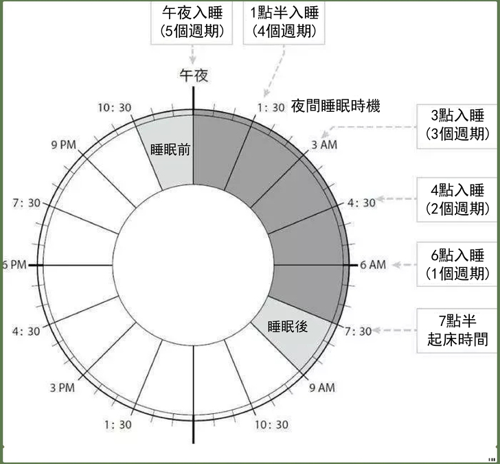 先從每晚5個睡眠週期開始,7天之後感覺如何。如果覺得5個週期太多了,就減少到4個週期。反之,如果没有睡夠,就增加到6個週期。你會知道什麼最合適自己。