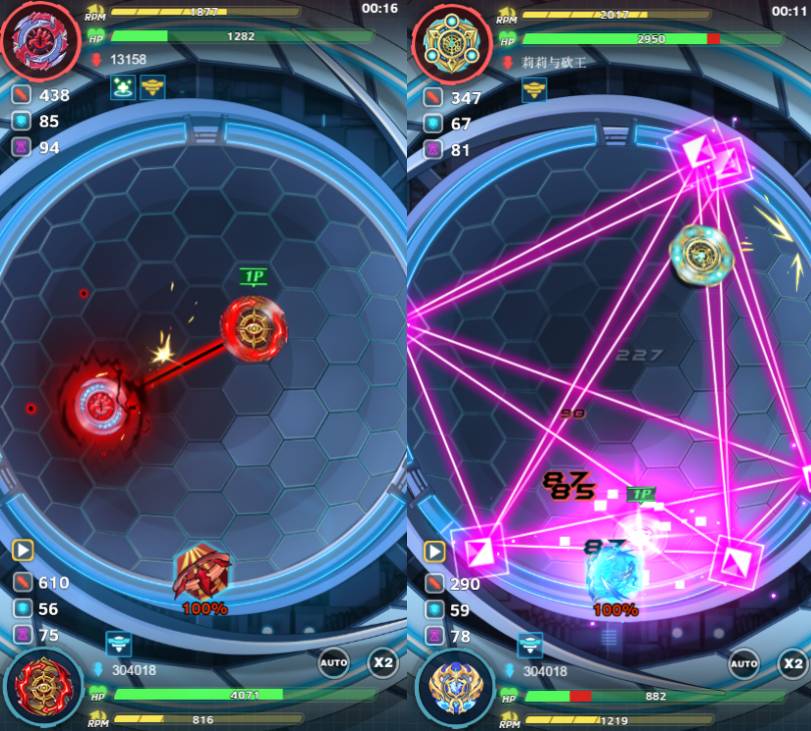 對於未接觸過戰鬥陀螺的玩家,遊戲提供了一連串新手教學,玩家可以很容易上手。戰鬥方面與真實戰鬥陀螺對戰相同,玩家可以選擇自己的組裝的陀螺進行對戰鬥,透過手指拖曳擲出陀螺與對方進行碰撞戰鬥,只要把對方血量或旋轉速度歸零就勝利了。雖然玩家並不能直接干涉陀螺間戰鬥,但透過陀螺本身左右旋轉特性、能力、玩家力度和擲出方向等要素,可以讓陀螺在戰鬥中獲得更多優勢。而且玩家也能在能量集滿時施放奧義技輔助戰鬥,場上也不時會出現一些隨機的元素,再搭配激昂的音樂,讓玩家對戰起來熱血滿點,更能感受戰鬥陀螺競技時那種專注和期待的興奮感。