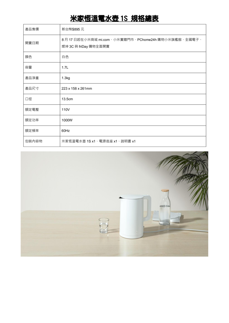 米家恆溫電水壺1S售價新台幣$895元,於8月17日起在小米商城mi.com、小米實體門市、PChome24h購物小米旗艦館、全國電子、燦坤3C與friDay購物全面開賣。