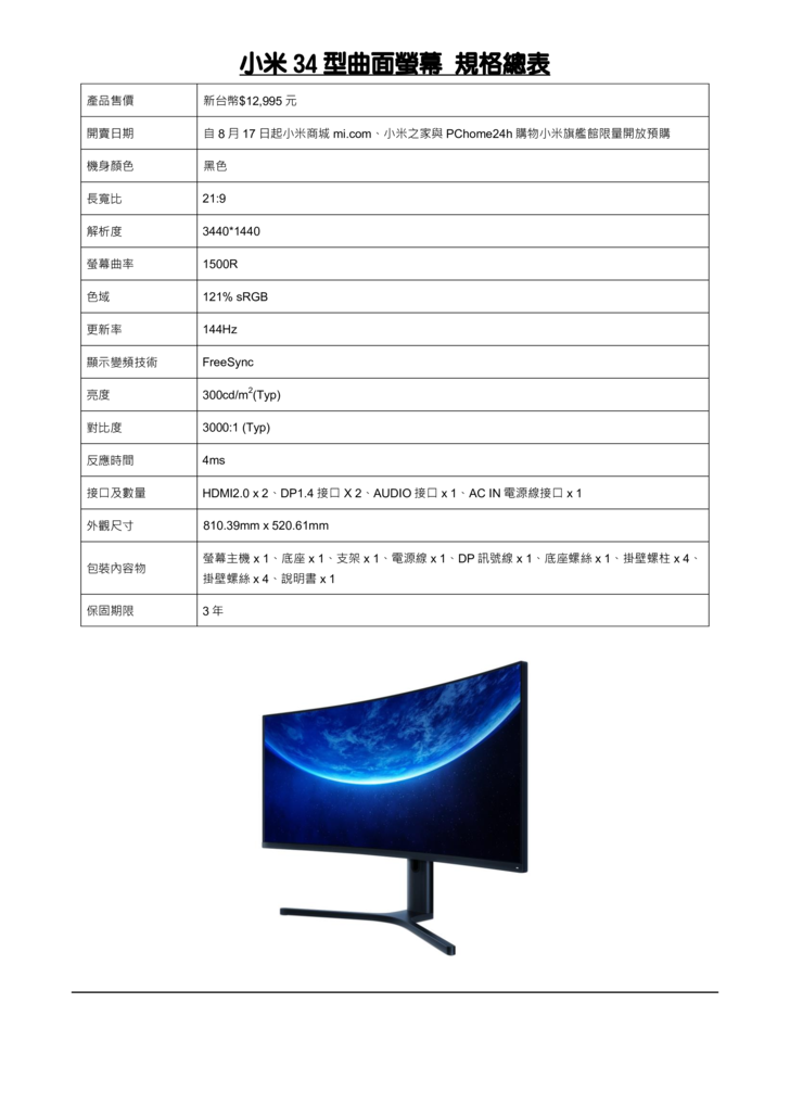 「小米34型曲面螢幕」售價新台幣$12,995元,於10週年感恩狂歡季期間限量開放預購,自8月17日起小米商城mi.com、小米之家與PChome24h購物小米旗艦館限量開放預購,其中於小米商城mi.com中首500名預購即可獲得小米10週年限定版及米粉必收藏《我們的時代》小米十週年10週年紀念畫冊。