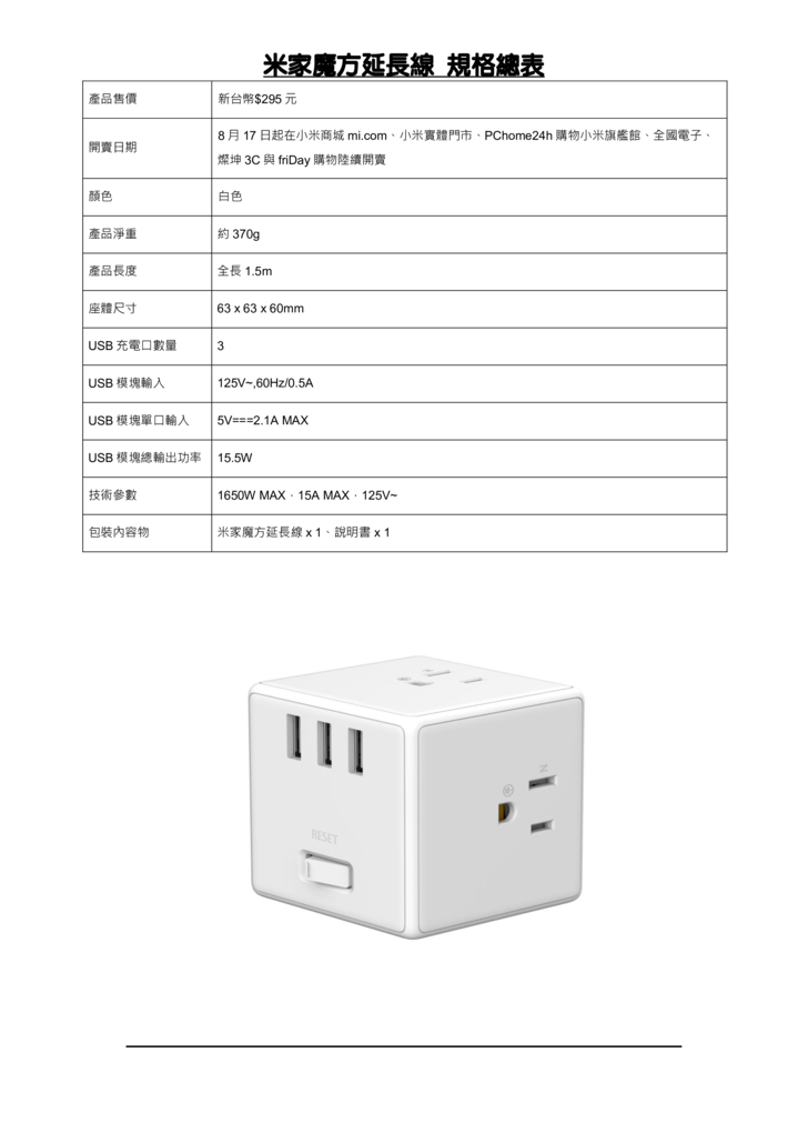 米家魔方延長線售價新台幣$295元,於8月17日起在小米商城mi.com、小米實體門市、PChome24h購物小米旗艦館、全國電子、燦坤3C與friDay購物陸續開賣。