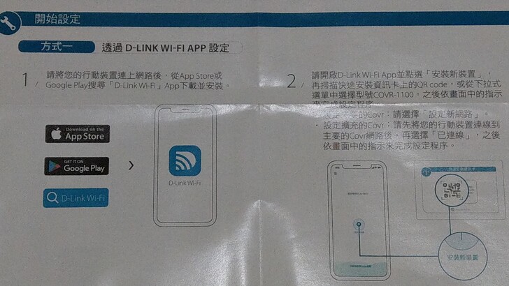 接下來是內容是說明這台機器的安裝使用方式,他有兩種可以設定COVR-1100,一個是通過他們自行開發的”D-Link Wi-Fi” App,一種是通過網頁瀏覽器去安裝設定。感覺他們比較推薦用手機App”D-Link Wi-Fi”去做安裝設定,以及後續常用的管理,畢竟現在大家使用手機的機率高又方便,所以才會推出App讓使用者容易上手,算是蠻跟得上時代趨勢潮流!