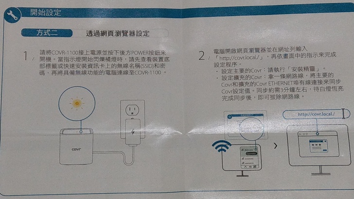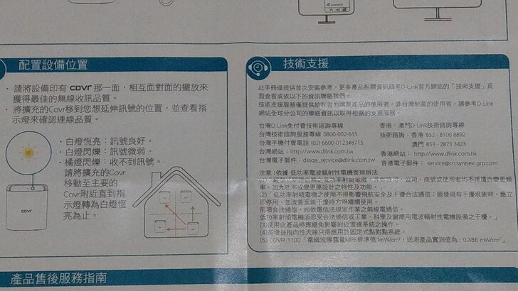 最後是說明COVR-1100要如何擺設才能得到比較好的訊號,還有,燈號代表的意義: 白燈恆亮-訊號良好,白燈閃爍-訊號微弱,橘燈閃爍-收不到訊號,最後是技術支援的部分。內容雖然不多,但還是能明瞭,表現是中規中矩。