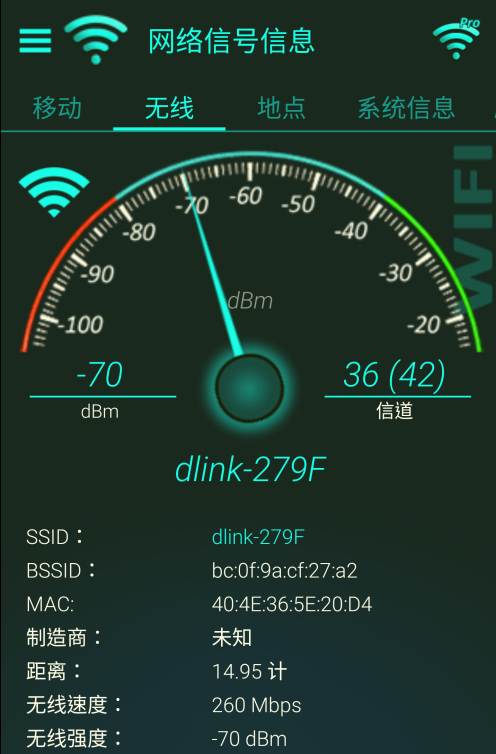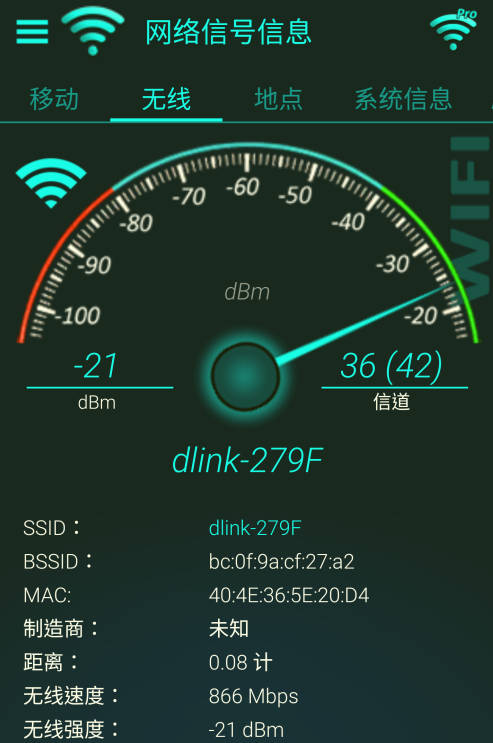 首先,當第一台COVR-1100放在臥室時,手機測試到的WiFi訊號是-21dB