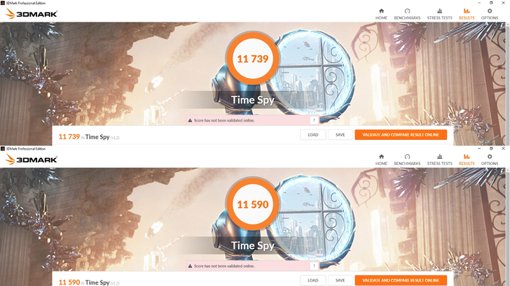 3DMark Time Spy 則是跑了 11590 分,使用 Intel 自家的 Intel XTU 超頻至全核 5.1 GHz 之後,Time Spy 分數則是來到了 11739 分。