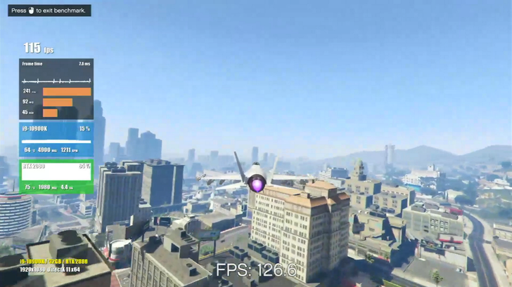 GTA V 的表現依舊符合期待,在特效全開的情況下基本上都能維持在 100 幀上下,少數較複雜場景會有小掉幀的情況,但也能保持在 80 幀以上,CPU 使用率也幾乎都在 10~20% 之間徘徊,最高也不超過 30%。