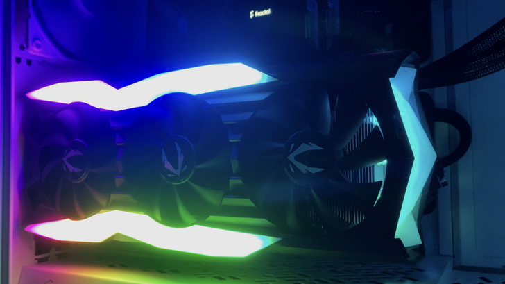 顯示卡使用 ZOTAC GAMING GeForce RTX 2080 AMP Extreme,是 2080 系列中的高階旗艦款,豪華的散熱配上帥氣的 RGB 燈,直接將信仰充值到滿點。搭配 Fractal Flex VRC-25 顯卡直立支架展示我的 ZOTAC RTX 2080 頂級顯卡,爽!