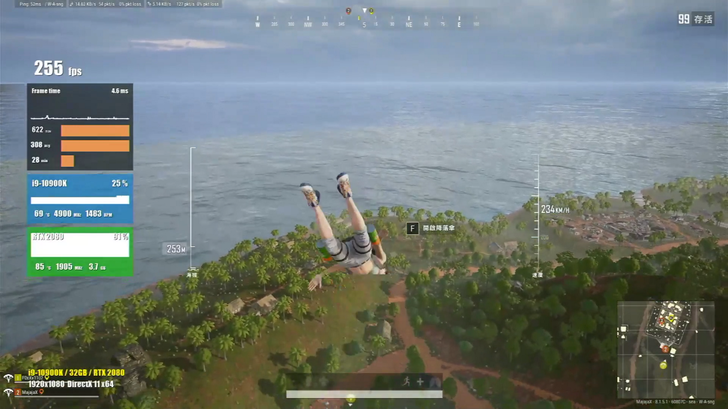 而 PUBG 這款較吃 CPU 的遊戲,不論是跳傘還是落地對槍,基本上幀數都保持在 200 幀上下,CPU 也才佔用大約 30%。