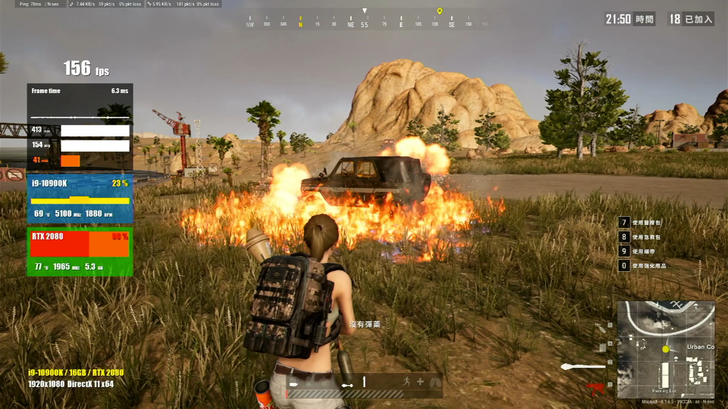 把 CPU 超頻至全核 5.1 GHz 之後,Apex Legend 的幀數一樣是保持在 144 左右,但 CPU 使用率確是降低了一些,整體而言大約降低了 5~10 個百分點。PUBG 的幀數平均大約多了 5~10 左右,CPU 使用率也有小小降低一些,而在特效更多的場景,例如汽油爆炸滿地火焰,也都能維持在 150 幀以上。