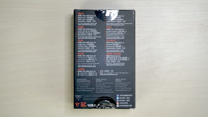 包裝的背面有用多國語言寫著產品特色,其中看到繁體中文的地方 - NVMe PCIe Gen4 x4,讀取速度......等等!Gen4 x4?這樣是升級還是降級啊!以 Gen4 來說速度這樣也太慢,但另一方面來說就是 Gen3 的無感升級 XD