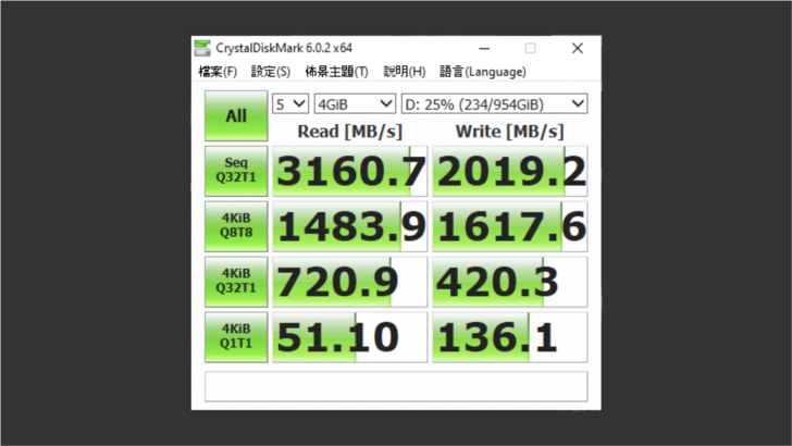 實測讀取速度 3,100MB/s,讀取超過 2,000 MB/s。不過因為是使用一陣子,非空盤的情況下測試,不然按照經驗,以這套搭配應該寫入 3,000MB/s 是沒問題的。