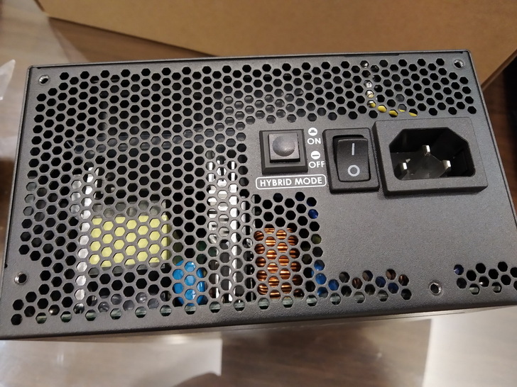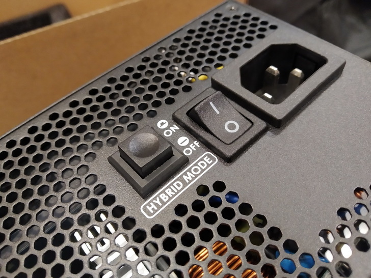 背後連接電源部分,有電源開關和Hybrid Mode模式按鈕,在低負載的使用情況下風扇不會運轉,延長風扇的使用壽命與達到靜音的功能,而這則是使用12公分的FDB液態軸承靜音風扇