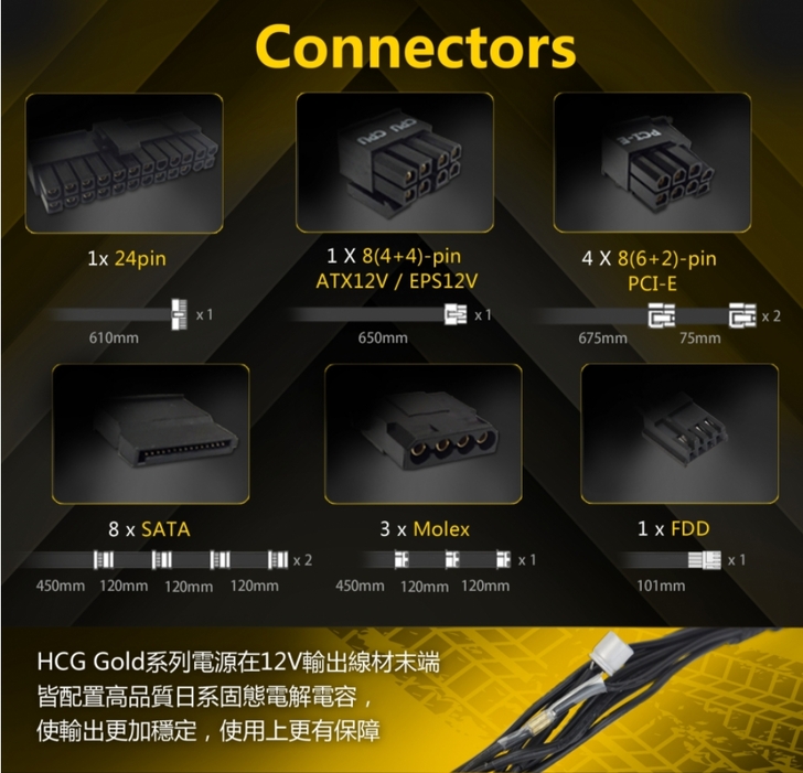 查到代理商官網的說明,才知道在12V線材末端還配有日系固態電容,感覺不錯,真是一分錢一分貨