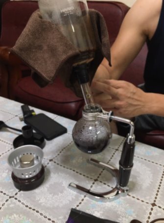 煮的時間不要太久,約略近45秒~1分鐘後熄火,再拿濕毛巾包住下壺的上方,,讓上壺的煮好的咖啡可以迅速下來