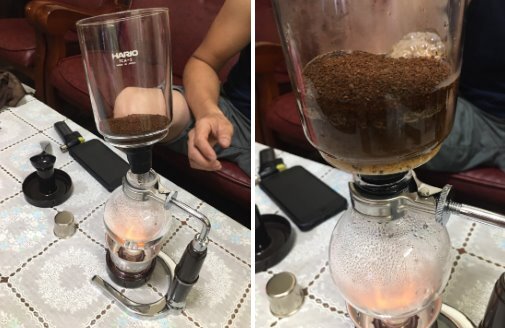 先將下壺加入熱水比較減省時間,上壺放入咖啡粉先斜插,待滾出現小水珠後,上壺再插正,然後等水慢慢上升