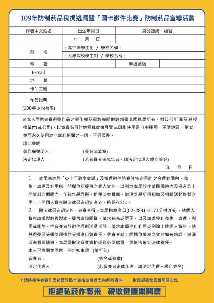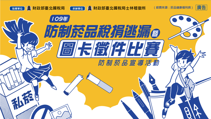 (財政部臺北國稅局 廣告)藉由舉辦防制菸品稅捐逃漏「圖卡徵選比賽」防制菸品宣導活動,讓參賽的青年學子吸收稅務新知,並將得奬作品延伸印製成文宣品及宣導品,以達深植人心。