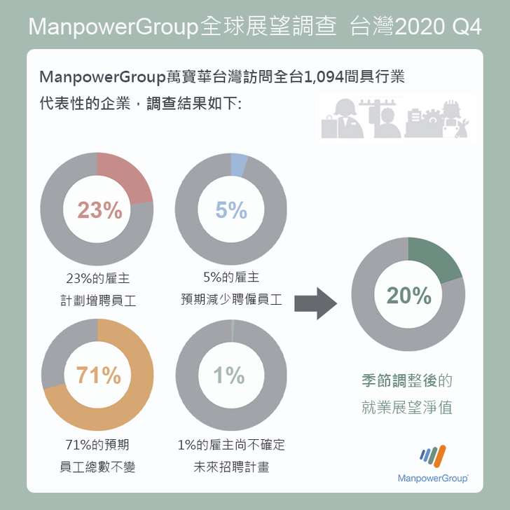 本次調查訪談台灣 1,094 位雇主,藉以了解企業於 2020年10至12月間的聘僱意願,結果顯示有23%預計增加人力,5%預計減少人力,71%維持不變。將增加與減少的人力相抵之後,得出就業展望淨值為+18%,排除季節因素後為+20%;與上一季相比增強了17個百分點,與去年同期相比下降2個百分點。
