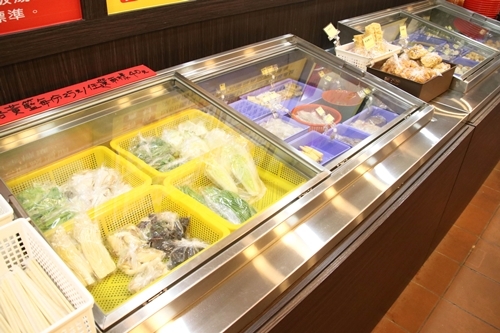 麻子辣點餐採取自助式,依個人喜好夾自己要吃的,用籃子顏色來區分價格,可以看見食材都很整齊擺放在冷藏櫃,種類相當豐富,蔬菜一袋的份量也蠻多的,這樣的食材衛生算做得很好