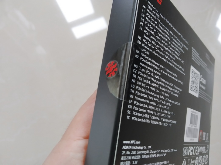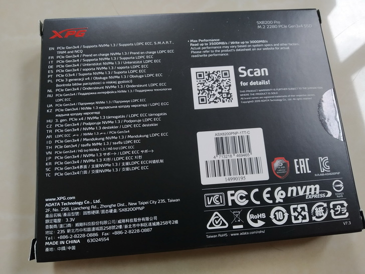 Adata XPG SX8200 Pro的包裝背面,標示規格等資訊,例如NVMe 1.3、LDPC ECC 除錯機制等,還有Made in China……