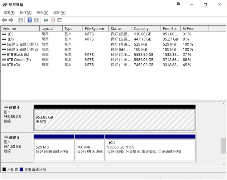 安裝時忘了拍,直接進系統就有抓到,進磁碟管理掛上去後格式化、搞定