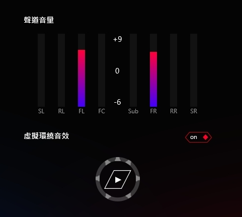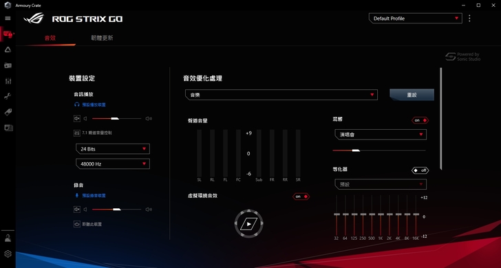 介面控制區 可以調整虛擬環繞7.1以及優化處理設定含混音器以及等化器的選項微調