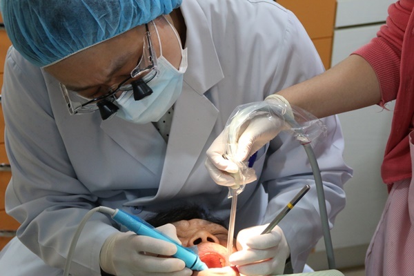 吳立琳醫師初步觀察x光圖及在老爸的口腔發現,缺牙位置的因長期戴假牙所以牙齦都萎縮了,同時牙齒也有不少的牙結石,加上老爸又常喝茶和咖啡,所以牙齒非常非常「黃」!除了缺牙處需要植牙或配戴活動假牙,其餘牙齒健在的地方也要美白……總之聽起來要處理老爸的牙齒肯定是項浩大工程!吳立琳醫師緊接著告訴老爸要開始洗牙清除口腔牙結石,過程可能會有點酸,可以抬個手示意,此時老爸表情也頓時凝重起來,我知道他肯定慌死了哈哈~