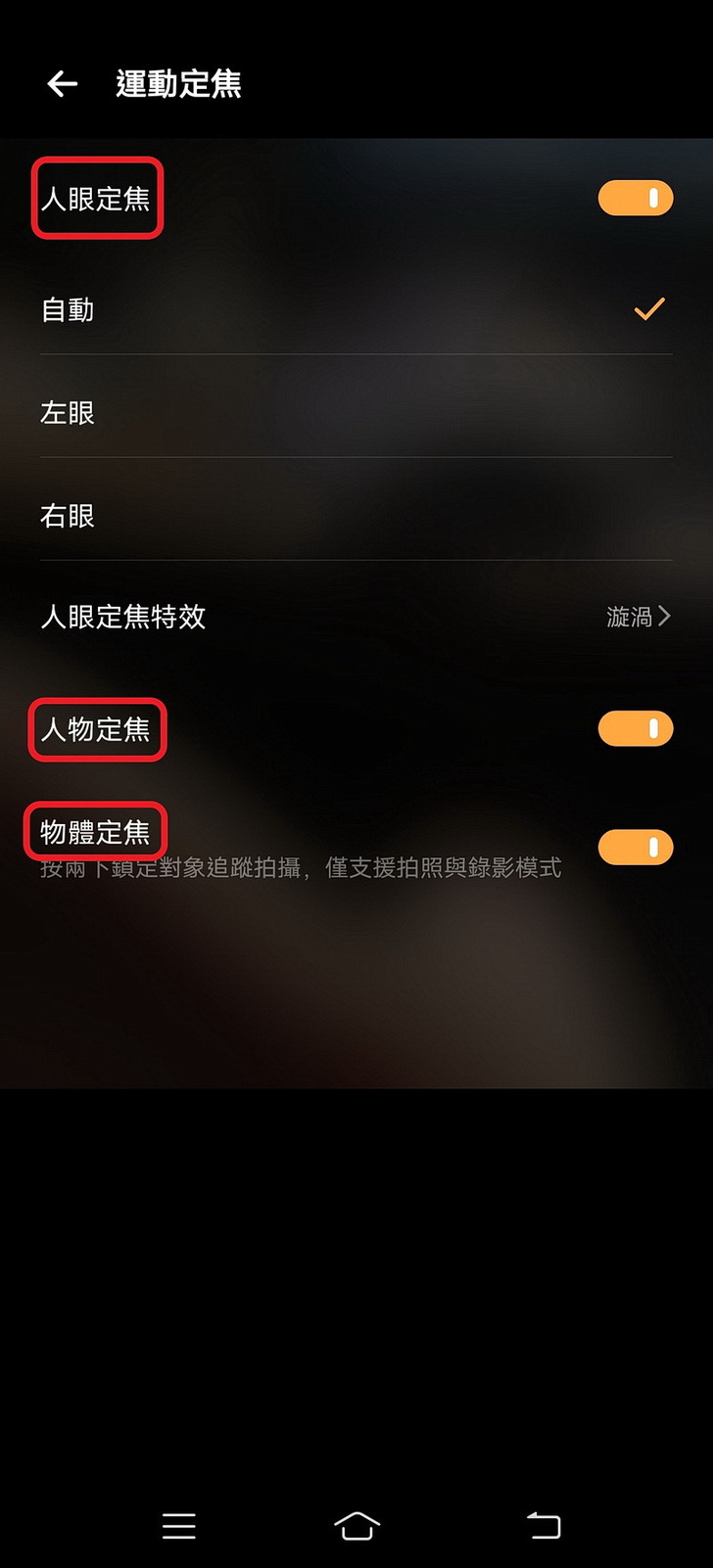 有了微雲台的強大防手震功能之後,vivo X50 Pro帶給我們的另外兩個強大功能,第一個是運動抓拍,首先我們先要打開運動抓拍的功能,把人眼定焦/人物定焦/物體定焦的功能先打開。不但拍照的時候可以用,連錄影的時候也可用喔。