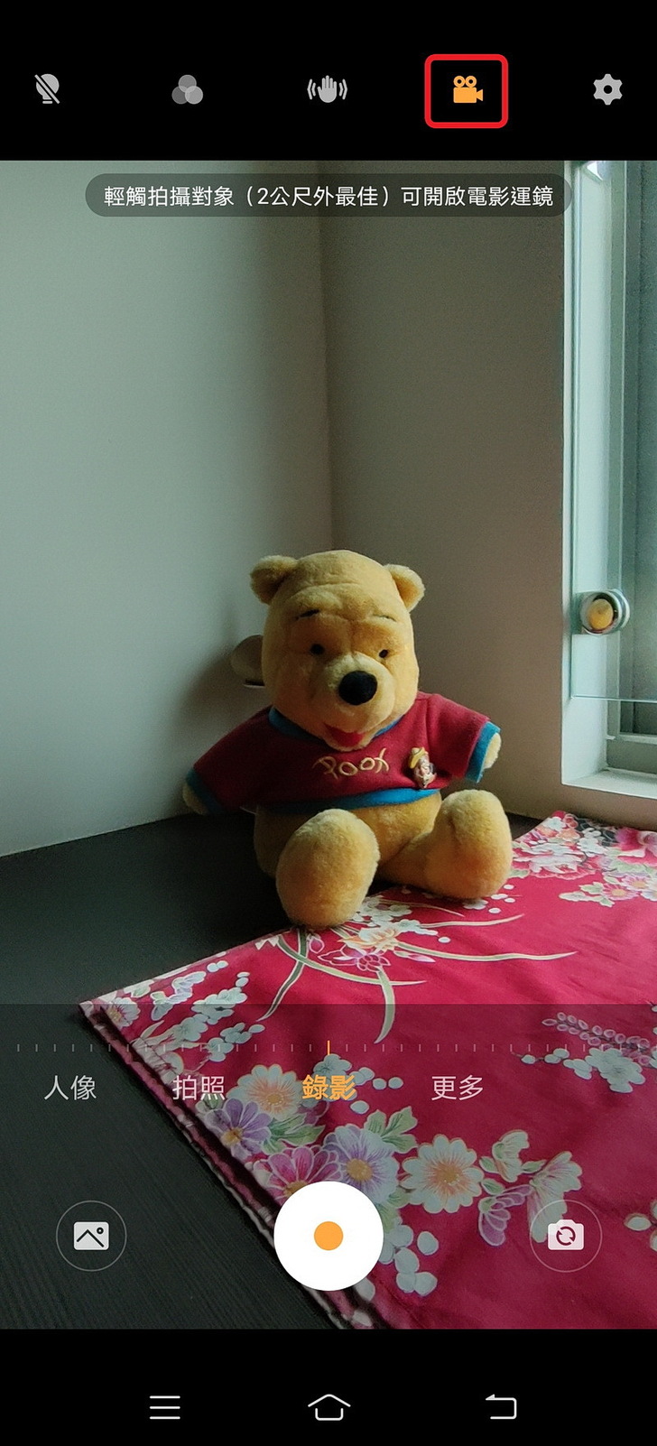 要開啟電影運鏡之前,有個攝影機的標示,記得要按下去,同時必須遵照指示,手機要離被拍攝主角距離2公尺以上這樣拍起來才會比較順手。